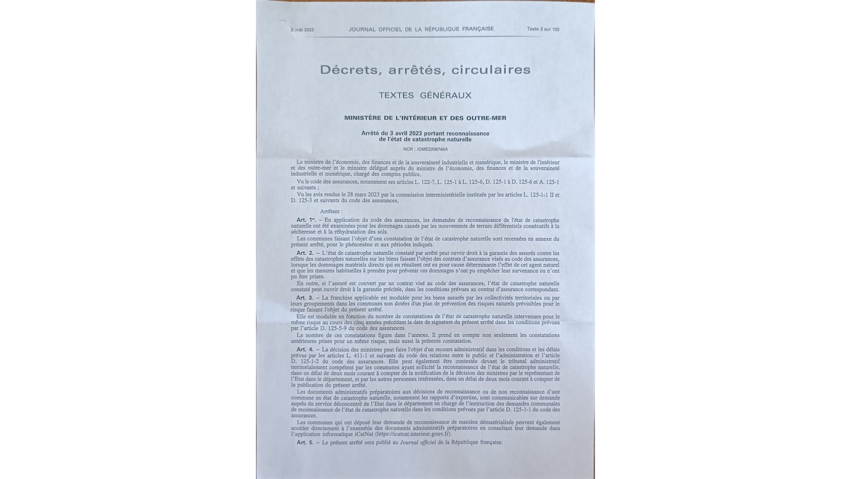 Les sinistrés disposent d’un délai de 30 jours à compter de la publication de l’arrêté au Journal officiel, soit le 03 mai 2023, pour effectuer leur déclaration de sinistre auprès de leur compagnie d’assurances.