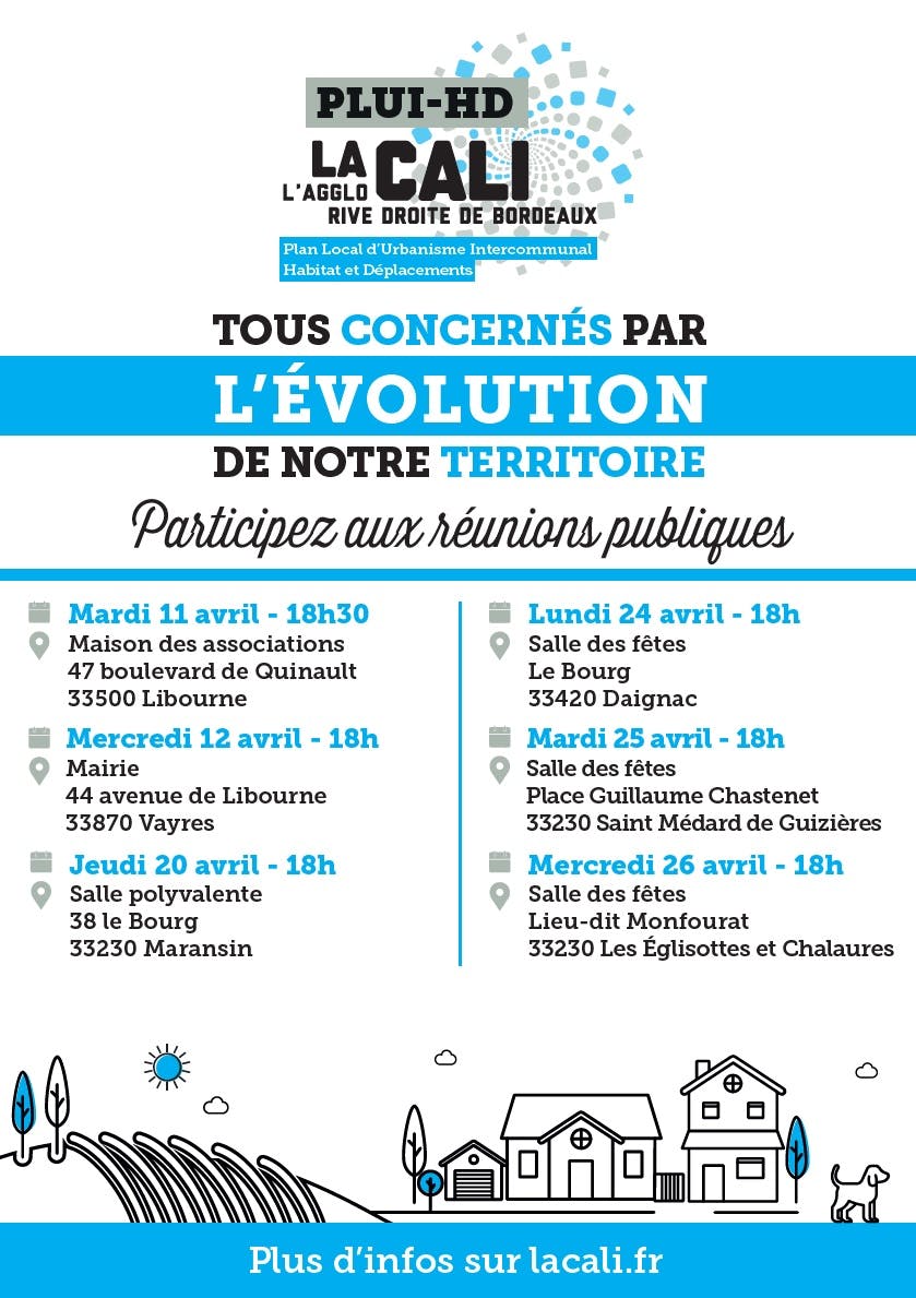 Dans le cadre de l’élaboration du PLUI-HD (Plan Local d'Urbanisme Intercommunal Habitat et Déplacements) de La Cali, 6 réunions publiques à destination de la population sont organisées afin de présenter des éléments de diagnostic.