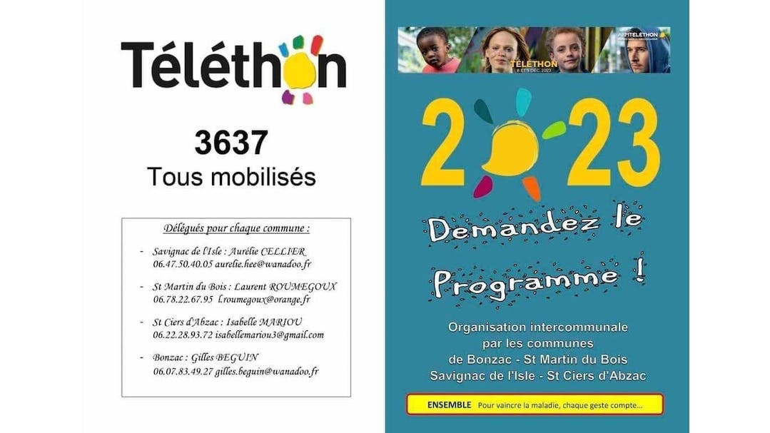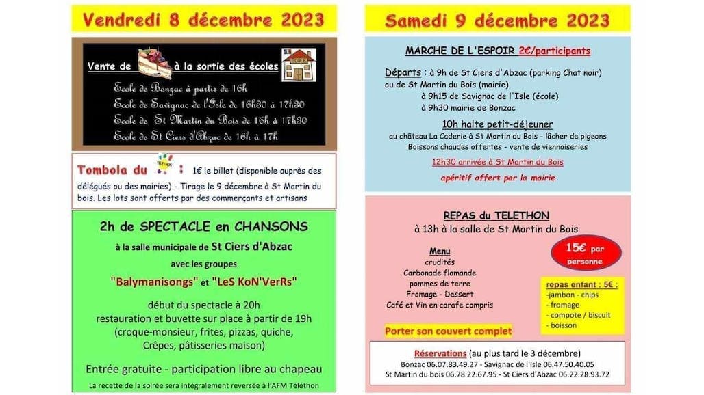 Comme chaque année, le téléthon est présent, grâce à l'organisation intercommunale de Saint Martin du Bois, Bonzac, Savignac de l'Isle et Saint Ciers d'Abzac. Les festivités se dérouleront du vendredi 08 décembre au samedi 09 décembre.