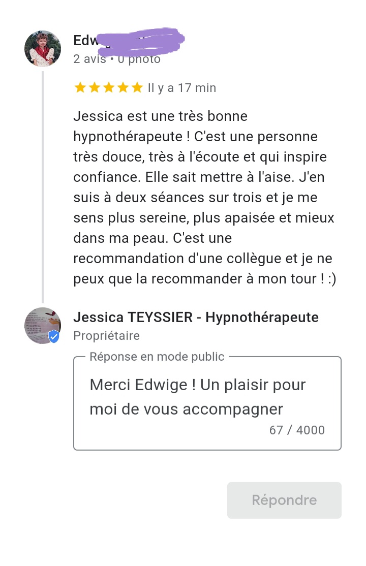 Je suis Jessica, j'ai 31 ans et je suis praticienne en hypnose Ericksonienne certifiée depuis 2 ans, formée à PNL, DNR et en psychologie positive.
